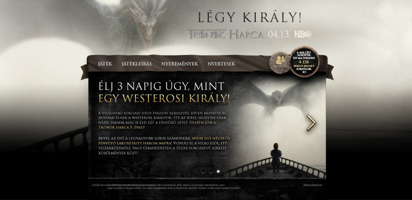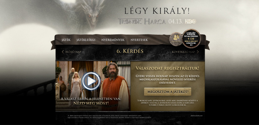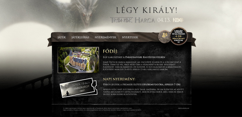 Légy király! nyereményjátékkal megtámogatott facebook applikáció indítása 10 nappal az új évad világpremiere előtt. Napi kérdések az 1. évad epizódjainak bevonó és megragadó jeleneteiből, amihez segítségül az app-ból elérhetővé tettük a teljes első évadot. Napi játékosszámhoz kötötten páros belépőket sorsoltunk a premier előtti díszbemutatóra. A fődíj nyertese luxuskörülmények között egy Kastélyhotel lakosztályában, harmadmagával, 3 napon át hangolódhatott rá az új évadra.